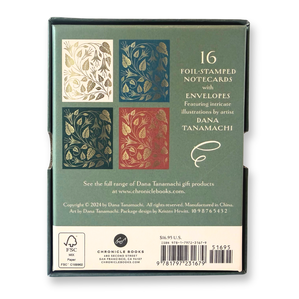 A collection of 16 dreamy, foil-stamped blank notecards from artist Dana Tanamachi. Each card features a shimmering foil pattern against rich hues and an embellished envelope.