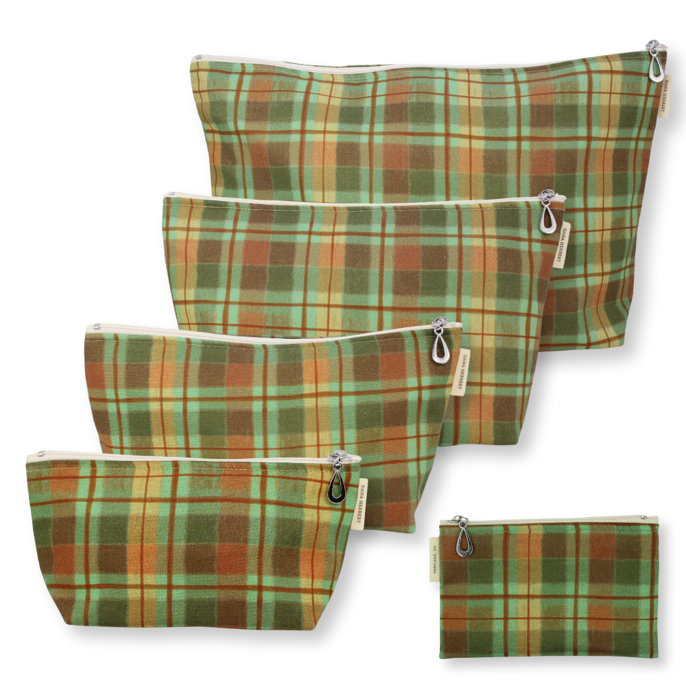 A full set of our popular Makeup Bags, plastic-lined cosmetic bags in cute cotton prints. The set includes one small, medium, large, XL and cotton coin purse. They can nest together. For additional sizes, look at our Dopp Kits!