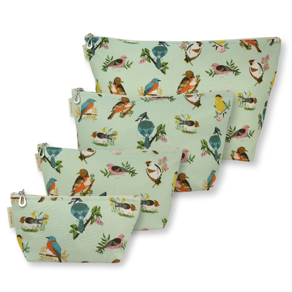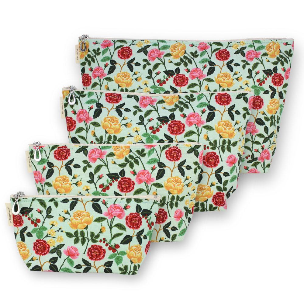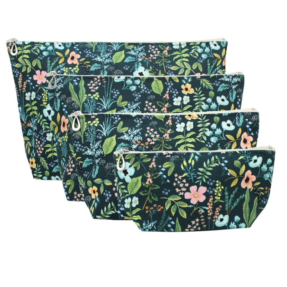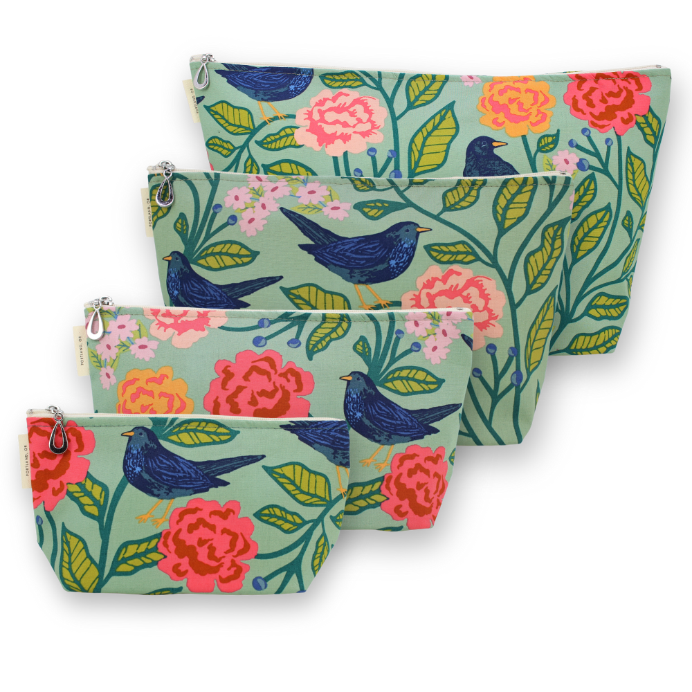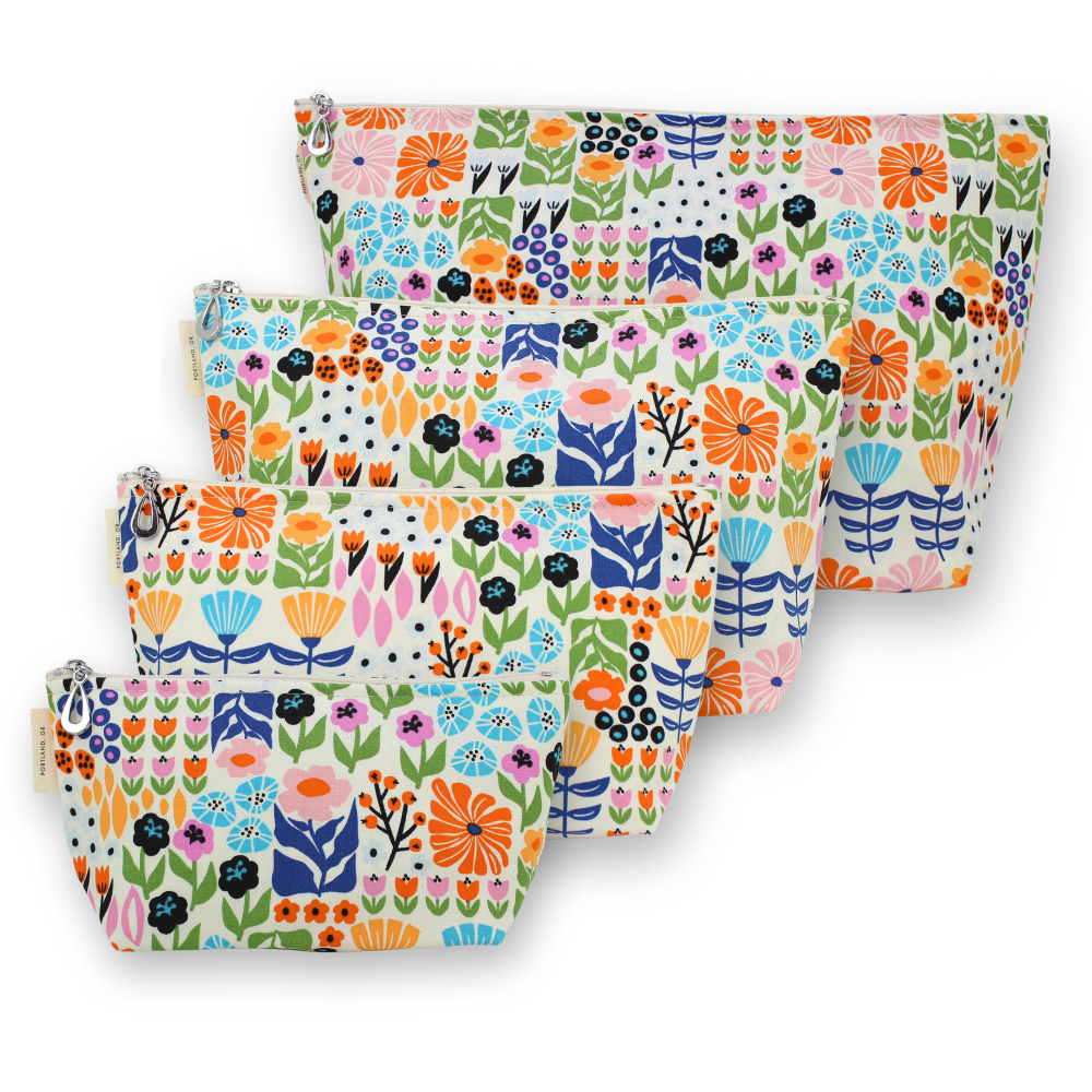 A full setĀ of our popular MakeupĀ Bags, plastic-lined cosmetic bags in cuteĀ cotton prints. The set includes one small, one medium, one large, and one XL. They can nest together. For additional sizes, look at our Dopp Kits and the cotton coin purse!