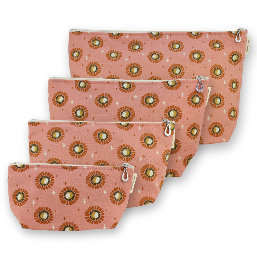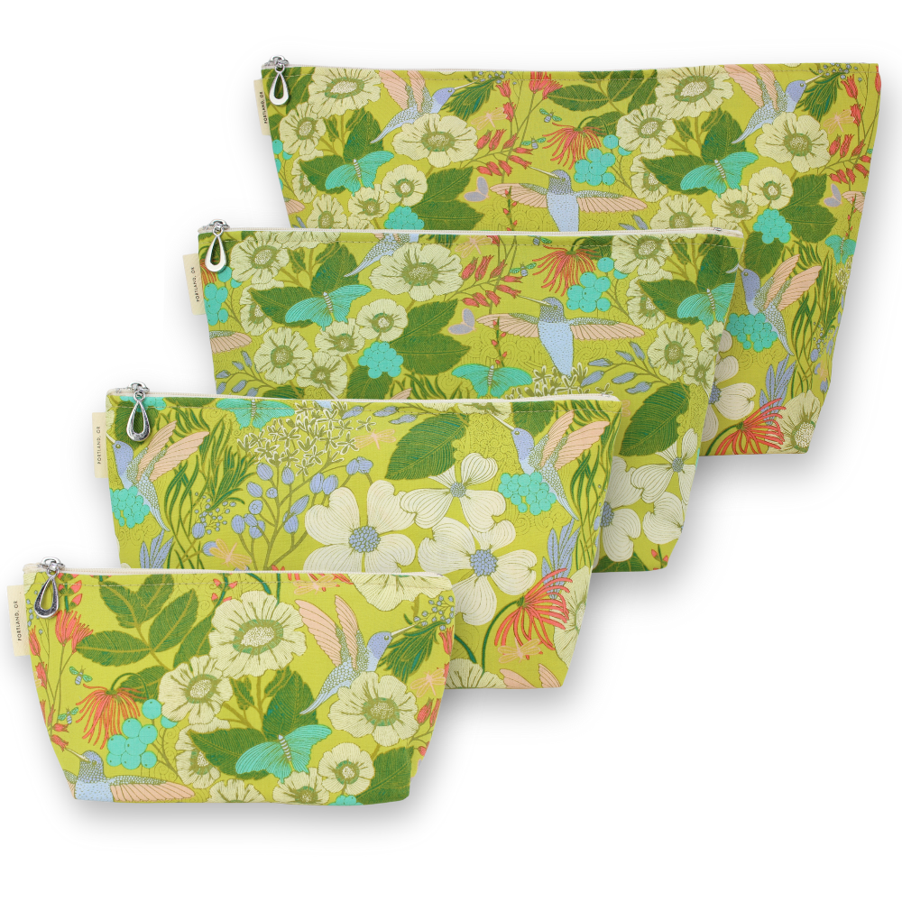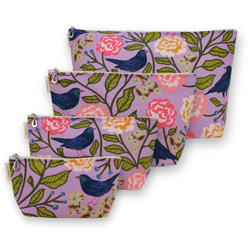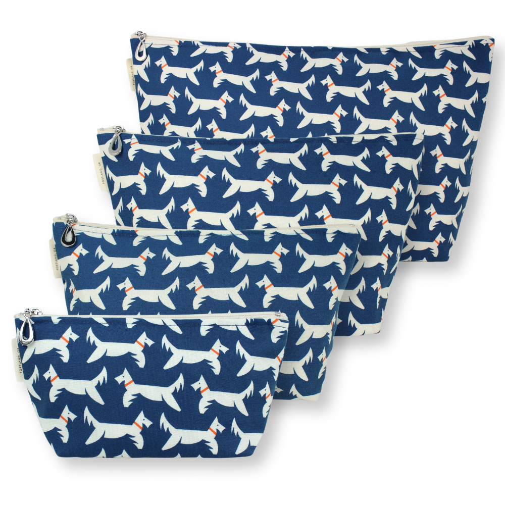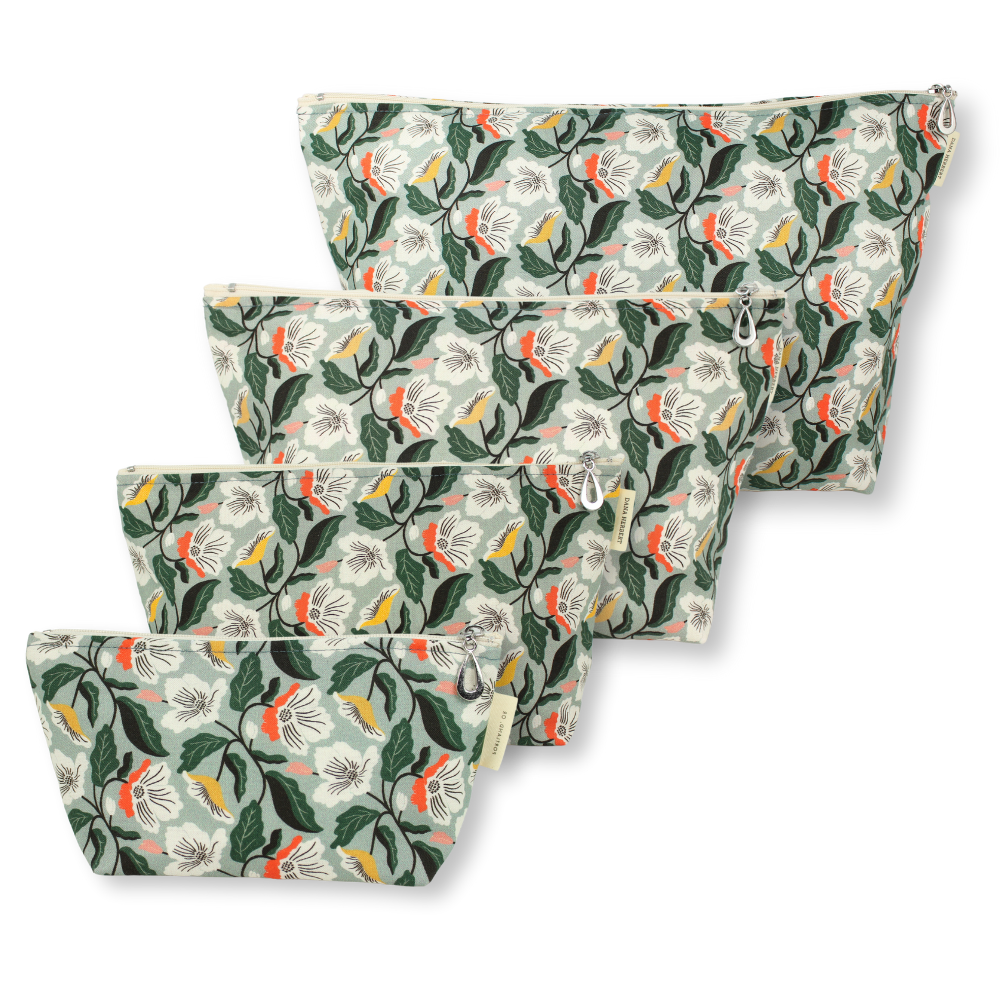 A full setĀ of our popular MakeupĀ Bags, plastic-lined cosmetic bags in cuteĀ cotton prints. The set includes one small, one medium, one large, and one XL. They can nest together. For additional sizes, look at our Dopp Kits and the cotton coin purse!