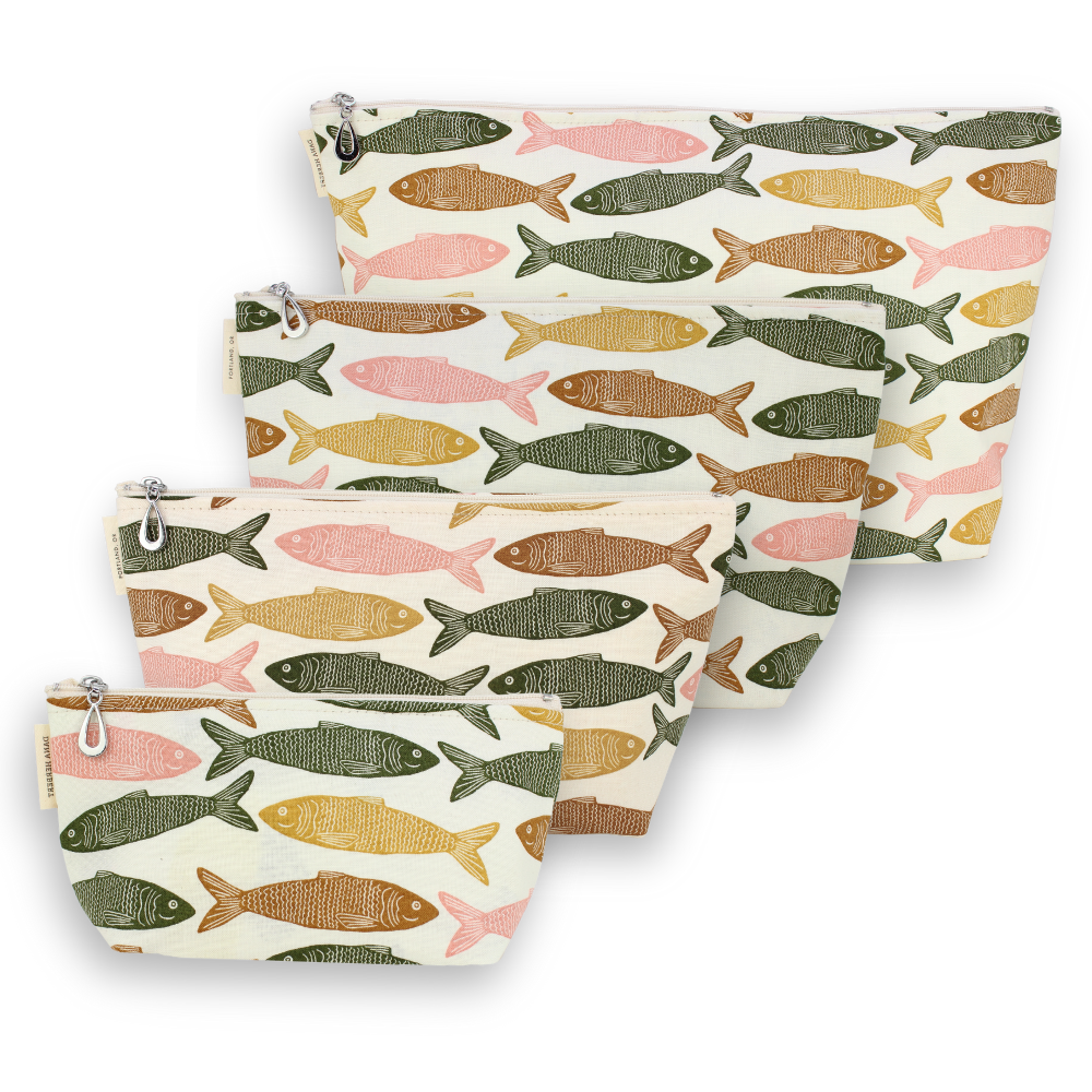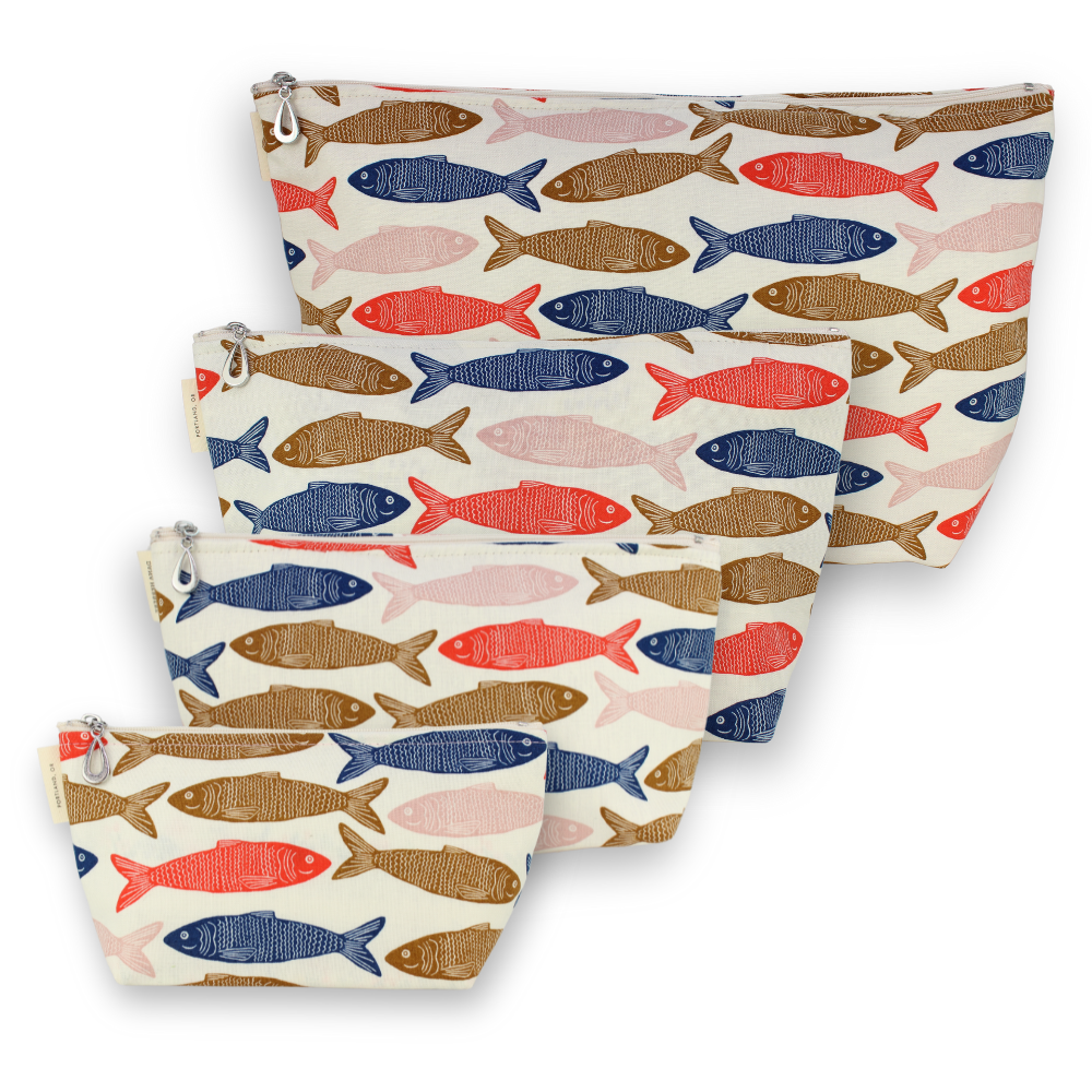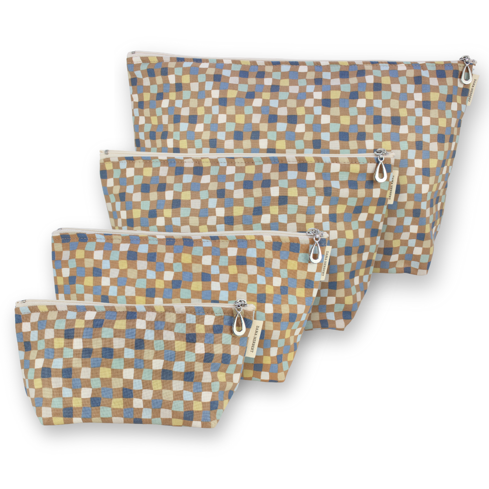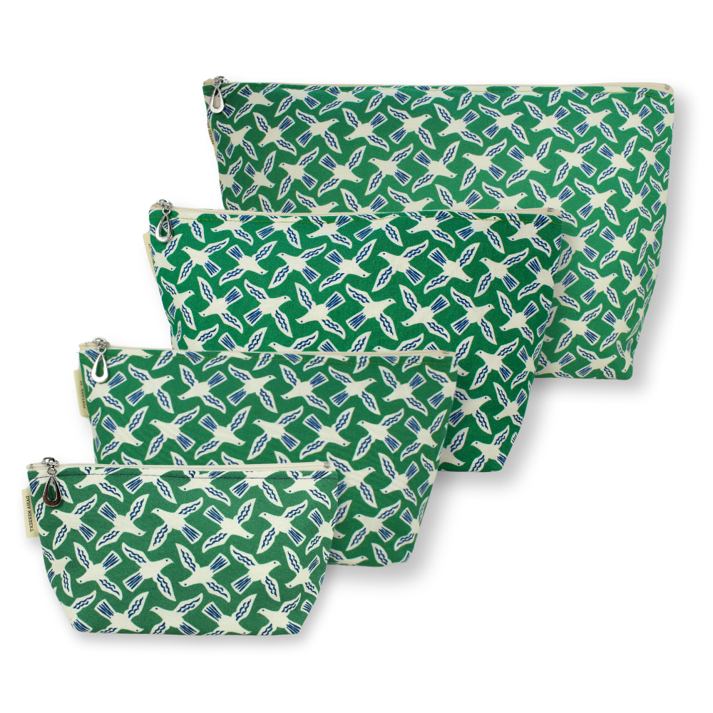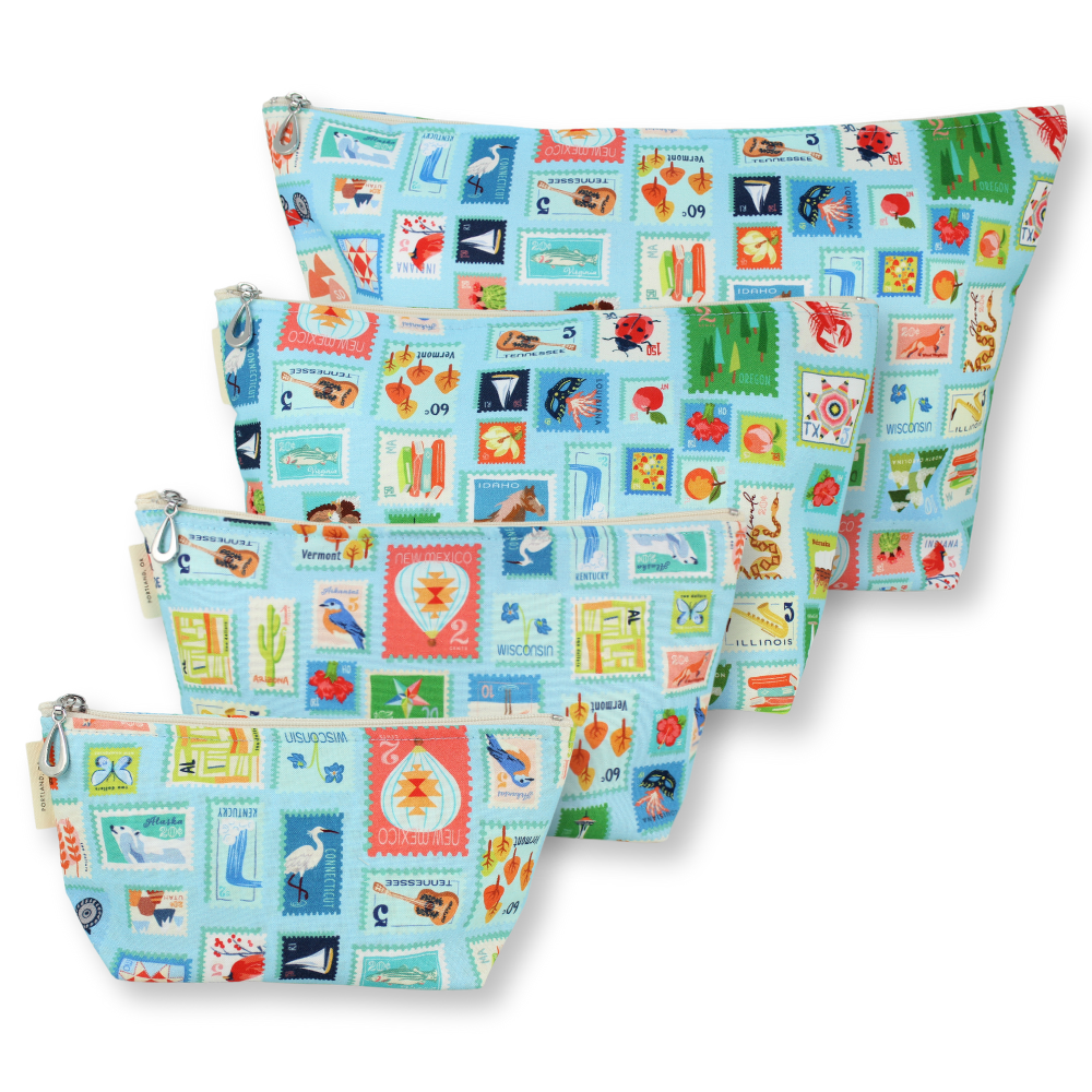A full setĀ of our popular MakeupĀ Bags, plastic-lined cosmetic bags in cuteĀ cotton prints. The set includes one small, one medium, one large, and one XL. They can nest together. For additional sizes, look at our Dopp Kits and the cotton coin purse!