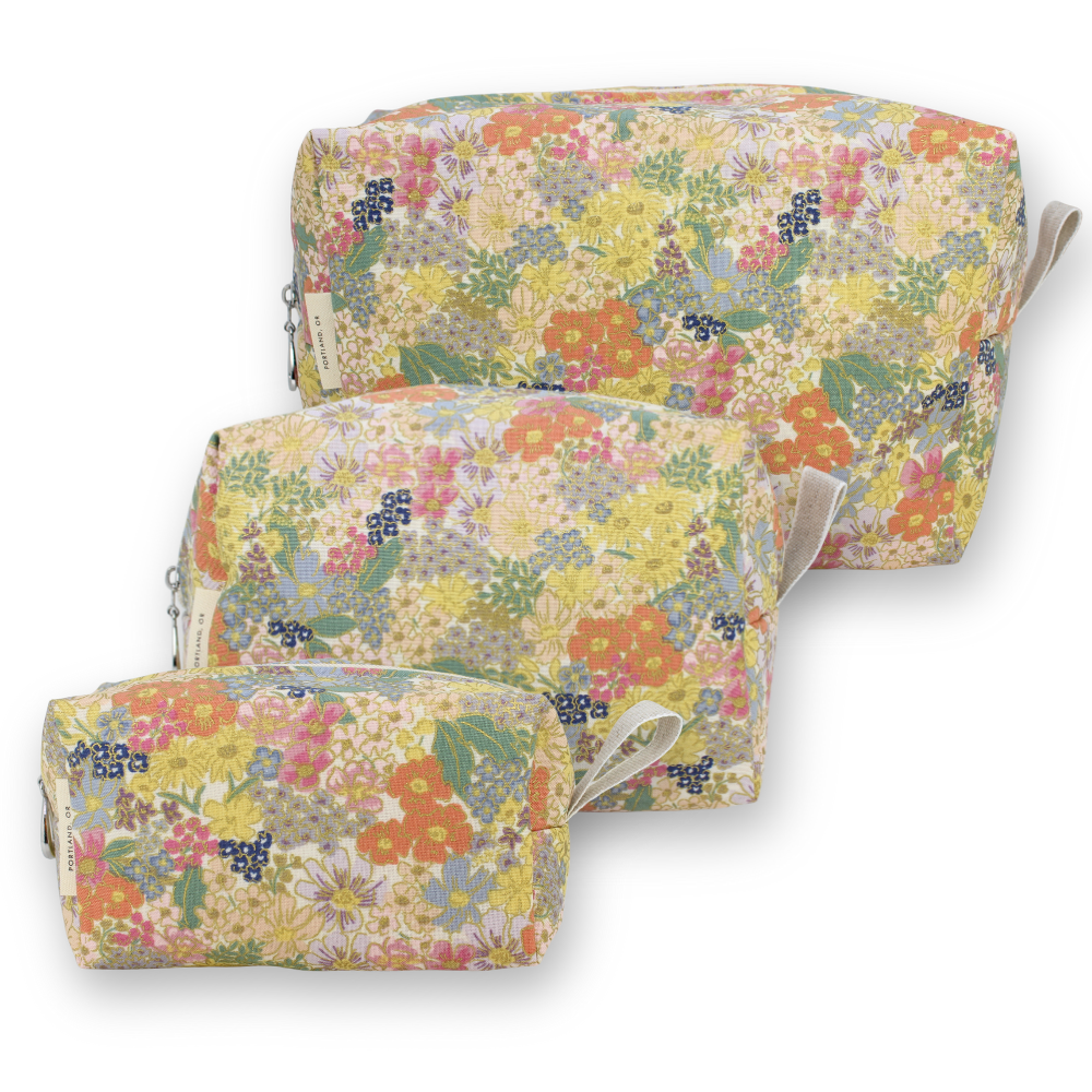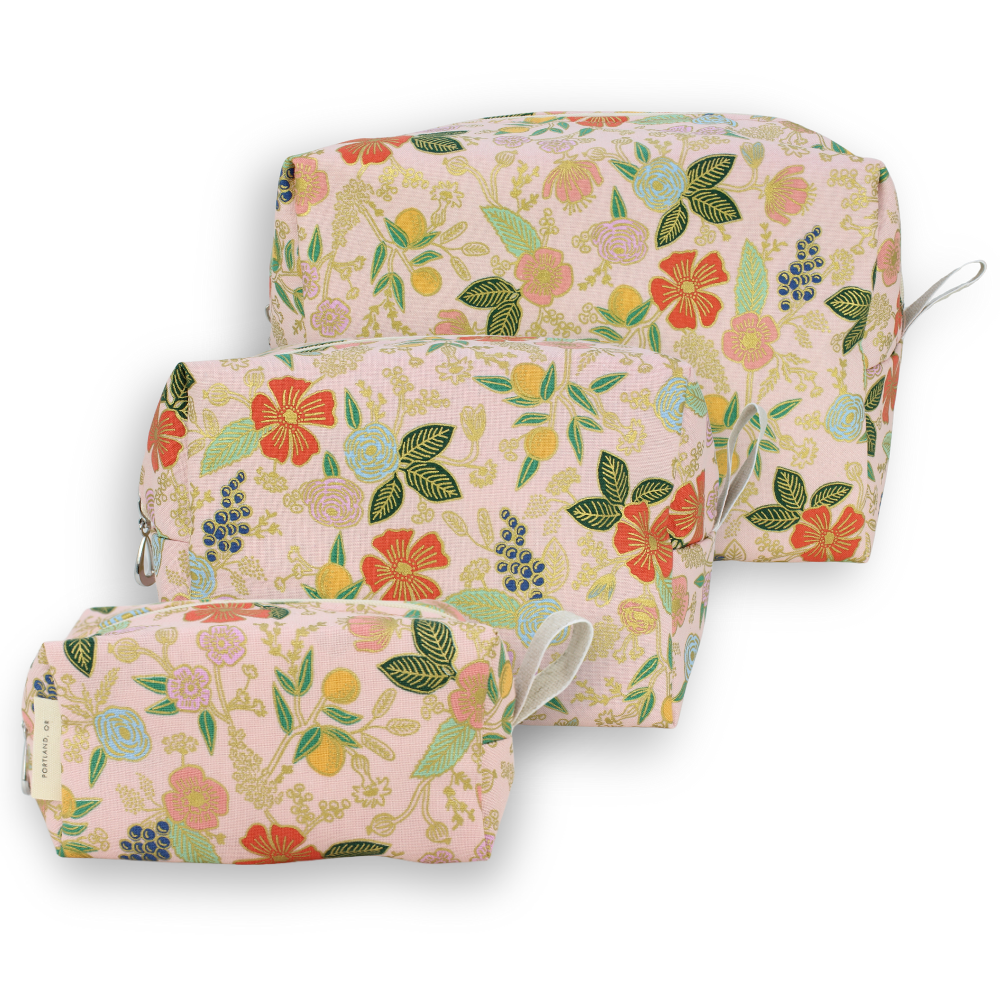 Dopp Kits, plastic lined bags in cute cotton prints, feature a gold metallic finish for an eye-catching edge. Perfect for travel or bathroom organizers! The set includes one small, one medium, and one large, and they can nest together for easy storage. For additional sizes, look at our Makeup Bags, the XL Makeup Bag, and the cotton coin purse!