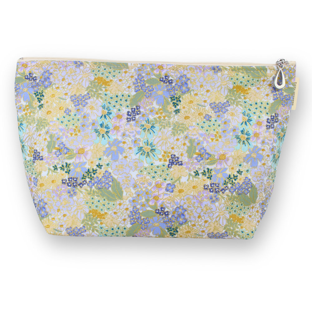 The third size of our popular Makeup Bags, a large cosmetic bag in a cute cotton print, featuring a gold metallic finish for an eye-catching edge.