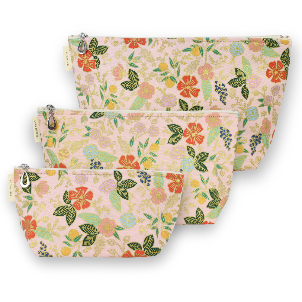A full set of our popular Makeup Bags, plastic-lined cosmetic bags in cute cotton print, featuring a gold metallic finish for an eye-catching edge.