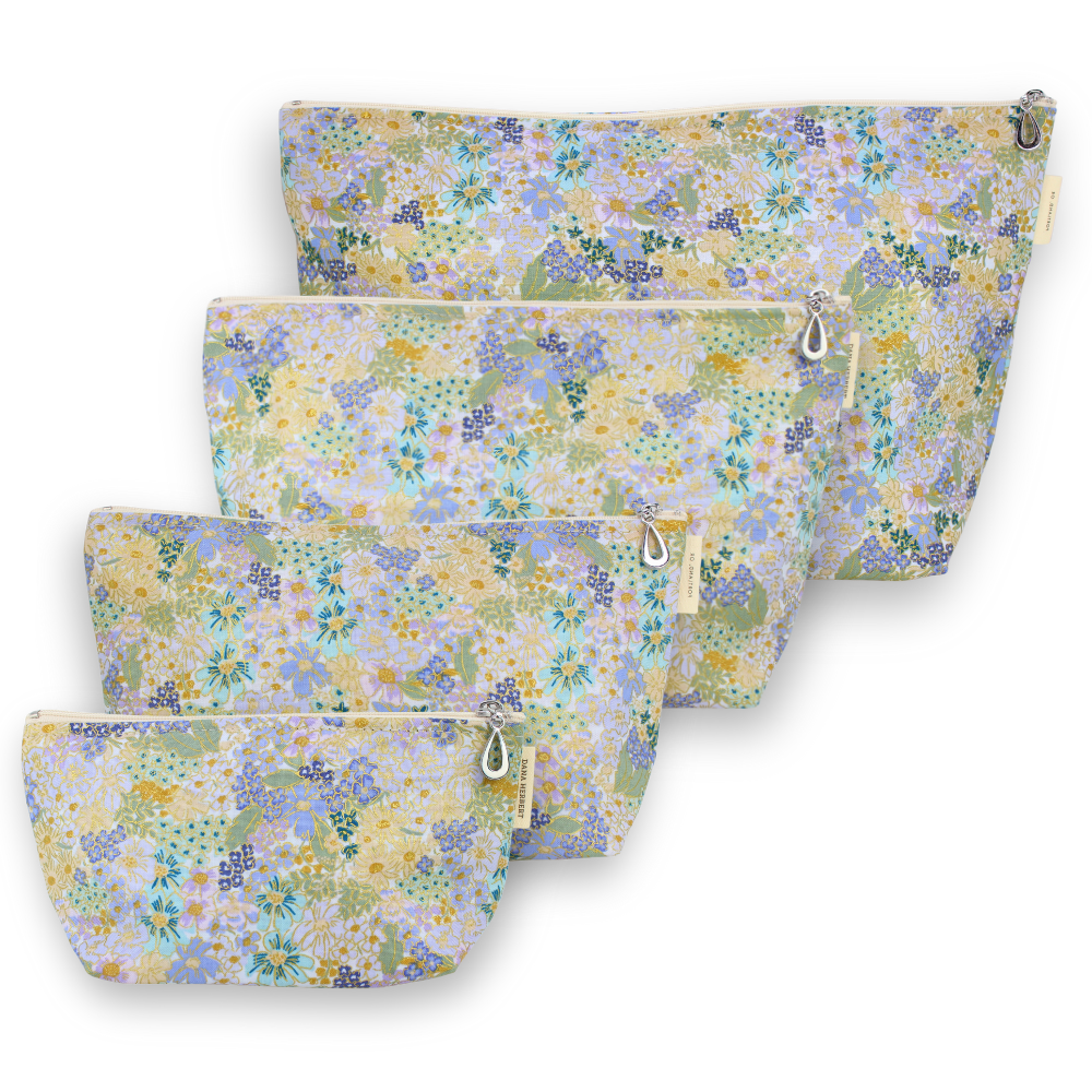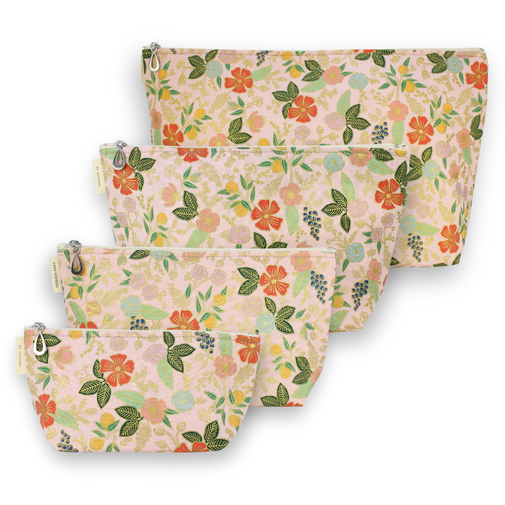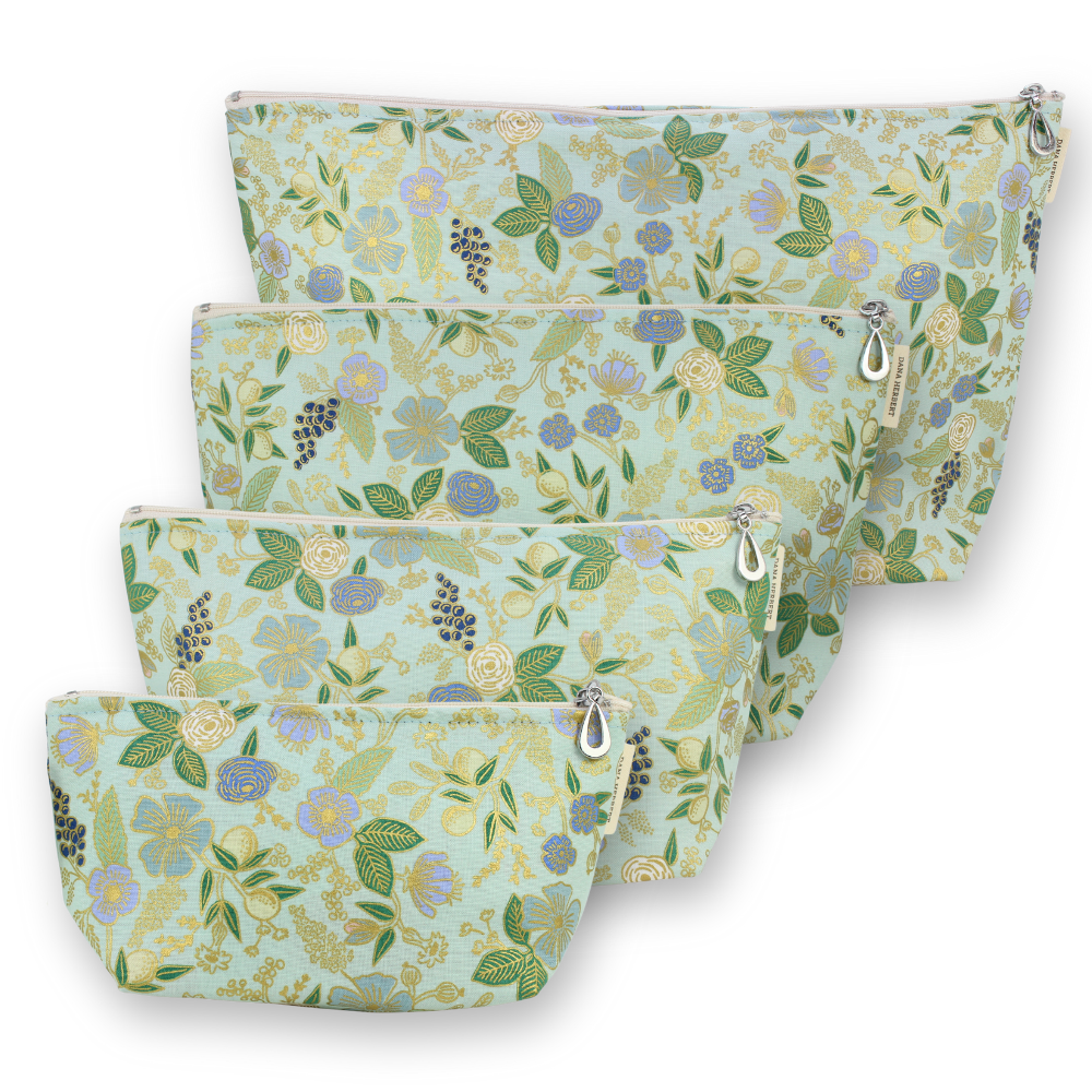 A full set of our popular Makeup Bags, plastic-lined cosmetic bags in cute cotton print, featuring a gold metallic finish for an eye-catching edge. The set includes one small, one medium, one large, and one XL.