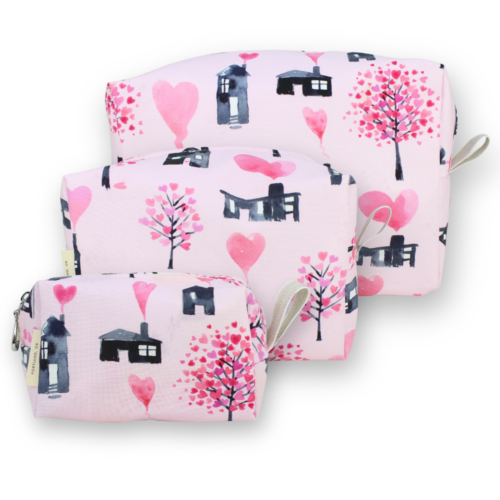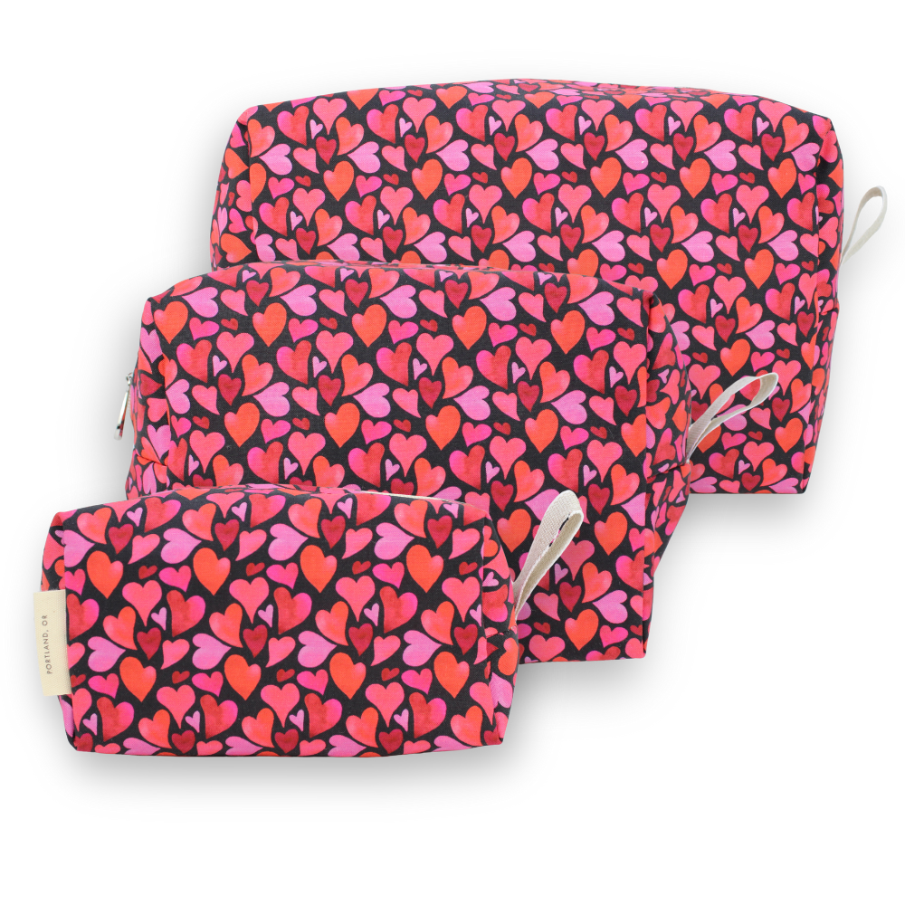 A full set of our popular Dopp Kits, plastic-lined cosmetic bags in Valentine's prints. The set includes one small, one medium and one large. They can nest together.