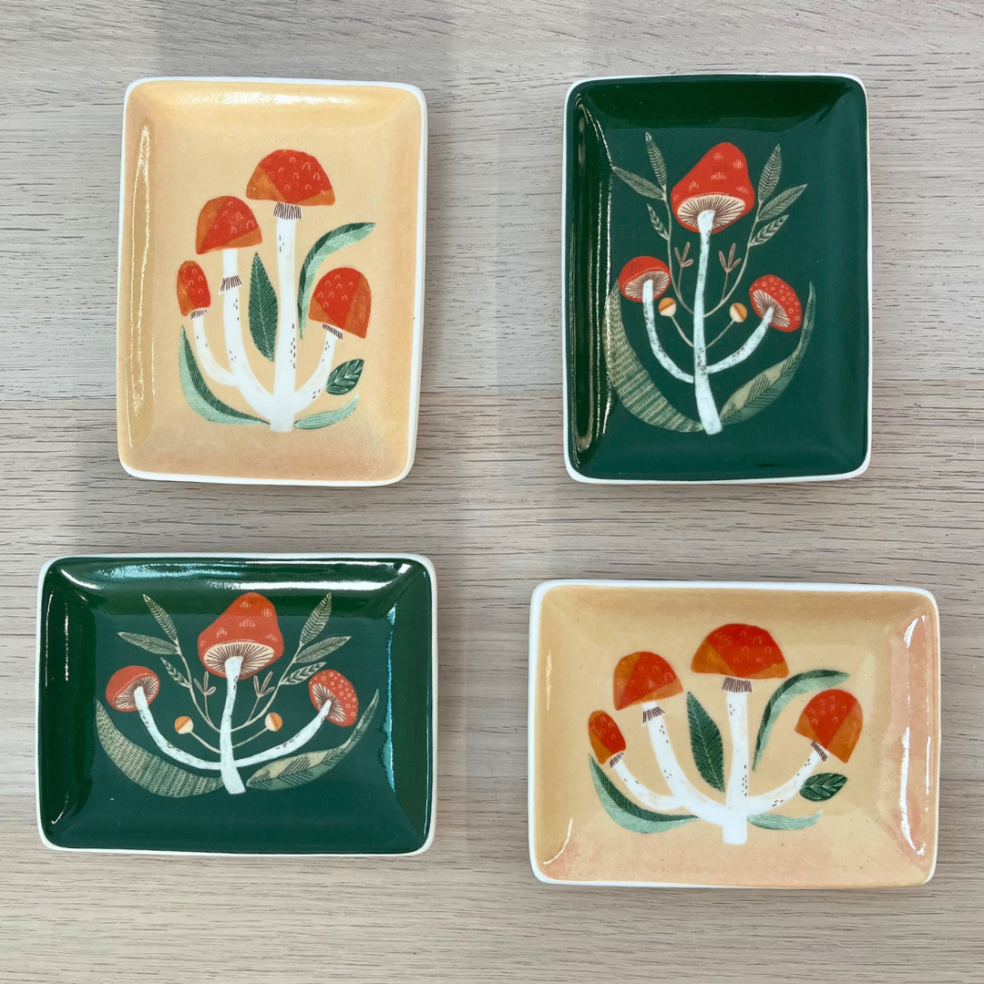 This stoneware dish features hand painted mushroom patterns. Made of durable, high-quality stoneware, and can be used for jewelry, keys, coins, snacks, or trinkets.