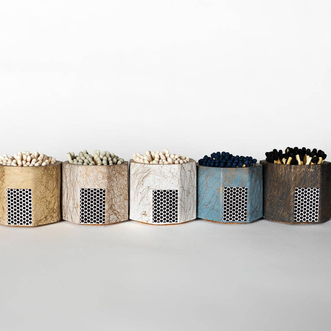 This is a handmade concrete match holder with a cork bottom to protect your surfaces. Each match holder is hand-painted with gold paint to take our Original from "wow" to "oh dang, that's cool." It comes with 70 safety matches and a striker sheet for easy lighting.