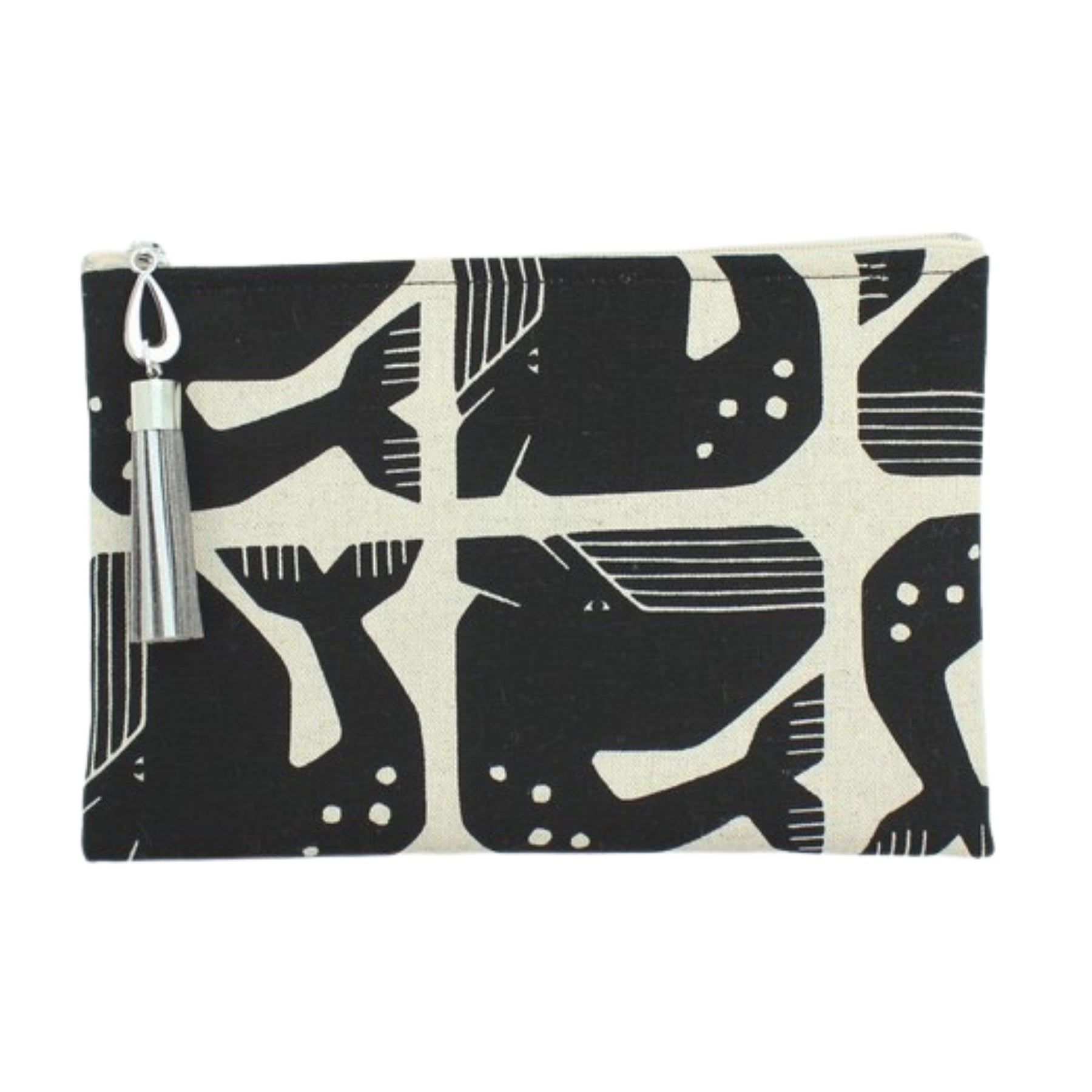 Measures 7.5" x 5", featuring a suede tassel, cotton printed lining and a zipper closure. Available linen/cotton prints. Spot Clean.