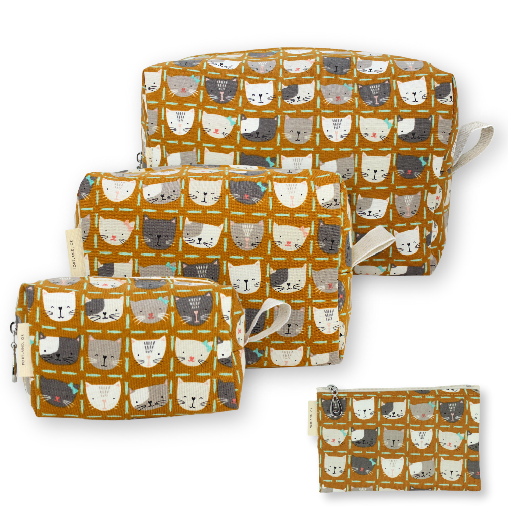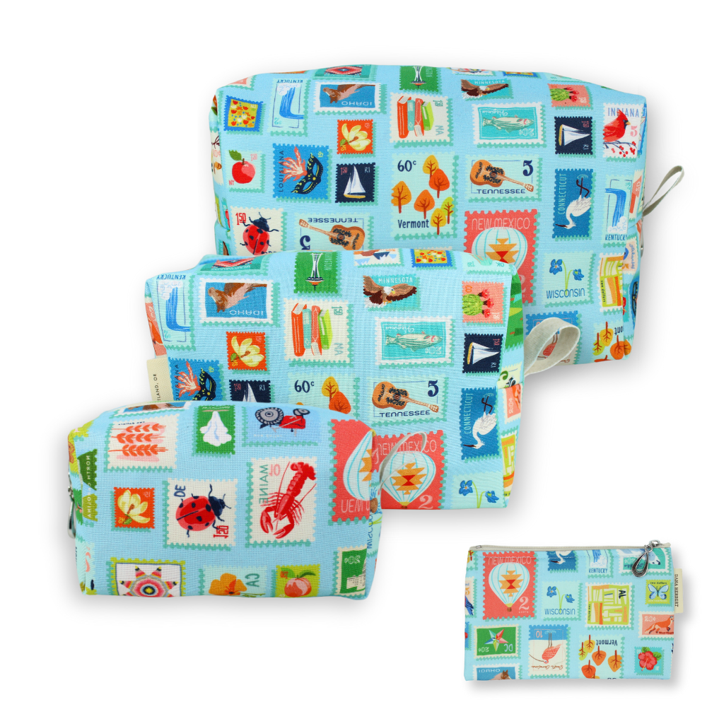 Dopp Kits- plastic-lined bags in cute cotton prints. Perfect for travel or bathroom organizers! The set includes one small, one medium, and one large + a coin purse! They can nest together for easy storage. For additional sizes, look at our Makeup Bags!