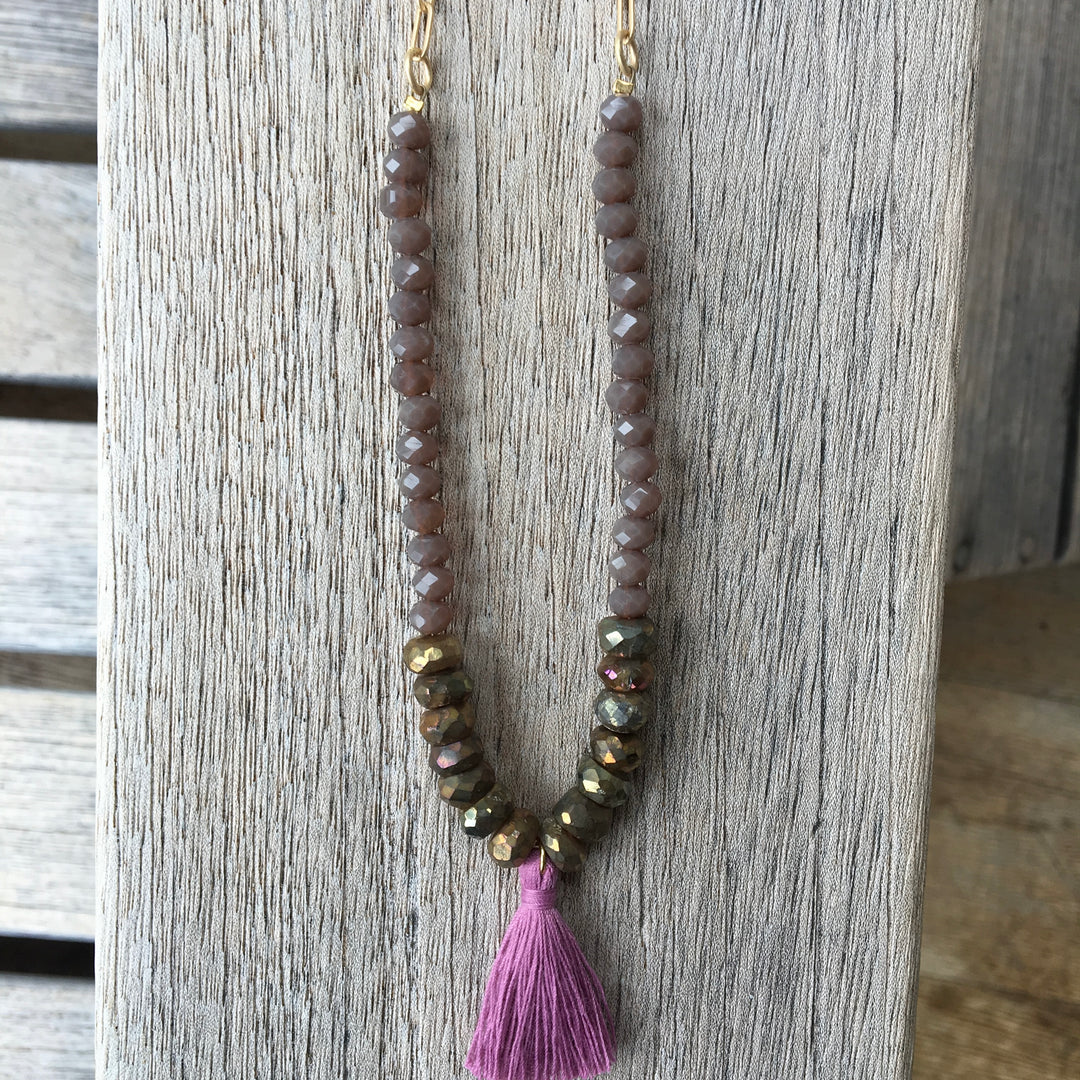 Crystal + Brown Labradorite Tassel Gold Necklace | SALE